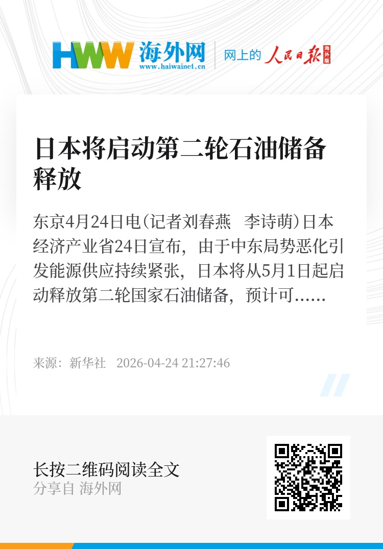 新华社东京4月24日电(记者刘春燕 李诗萌)日本经济产业省24日宣布,由于中东局势恶化引发能源供应持续紧张,日本将从5月1日起启动释放第二轮国家石油储备,预计可满足国内20天需求。
