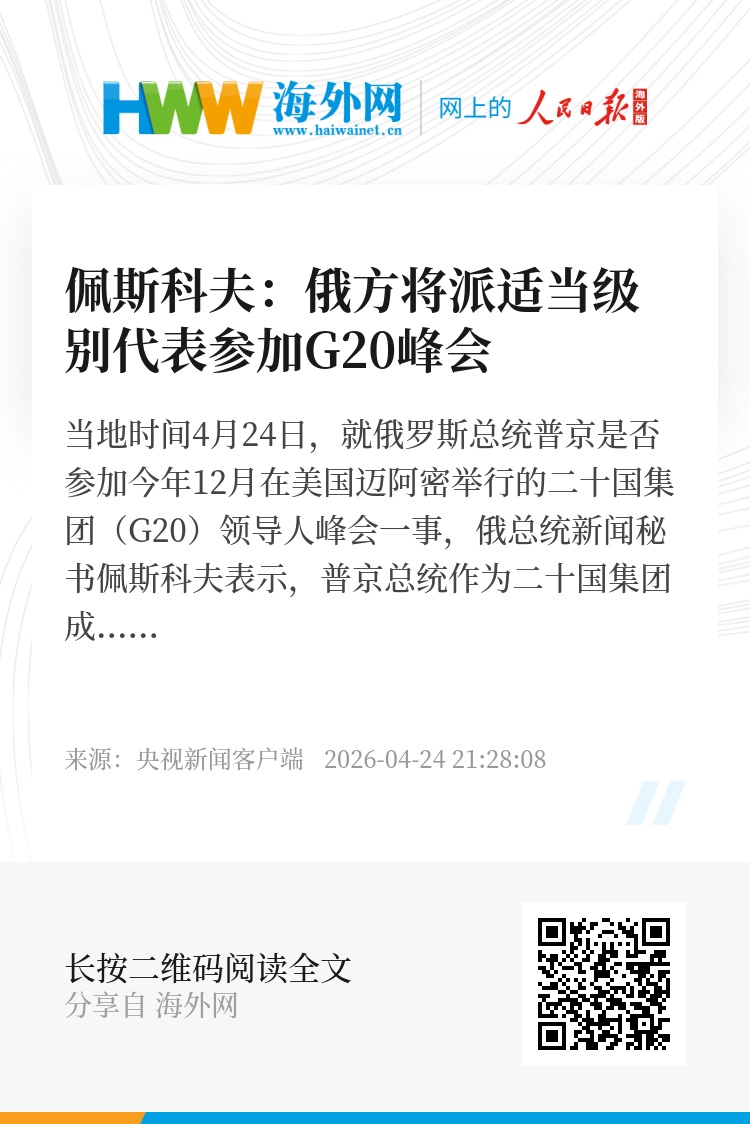 当地时间4月24日,就俄罗斯总统普京是否参加今年12月在美国迈阿密举行的二十国集团(G20)领导人峰会一事,俄总统新闻秘书佩斯科夫表示,普京总统作为二十国集团成员可能前往迈阿密,也可能不前往,或者由俄方其他代表出席。但无论如何,俄方将在该峰会上派出适当级别的代表。