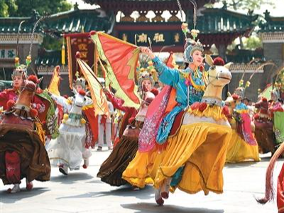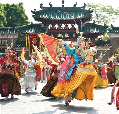 近日,不少地方举行丰富多彩的民俗活动,欢度“三月三”传统节日。图为在广东佛山祖庙北帝诞春祭大典上拍摄的民俗表演“潮州布马舞”。
