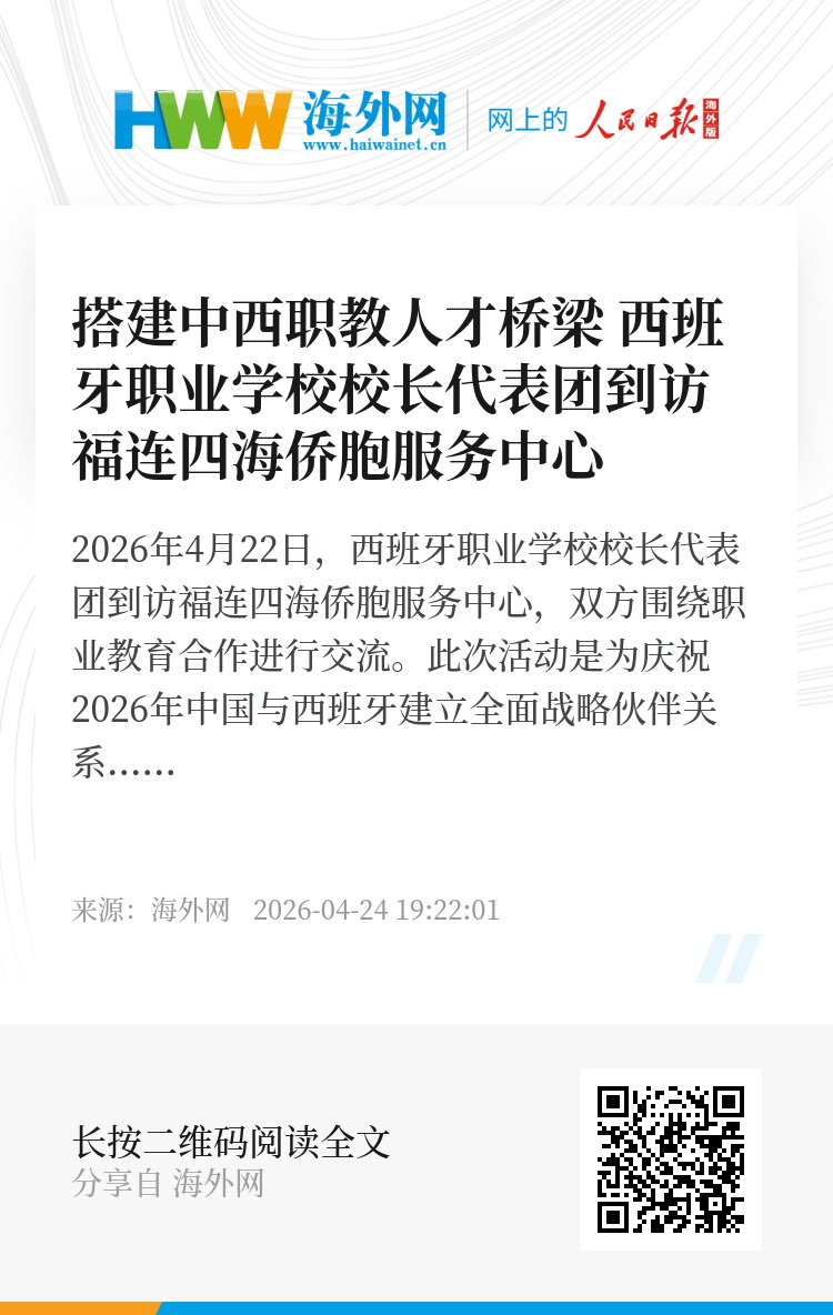 2026年4月22日,西班牙职业学校校长代表团到访福连四海侨胞服务中心,双方围绕职业教育合作进行交流。此次活动是为庆祝2026年中国与西班牙建立全面战略伙伴关系20周年,推动两国职业教育资源共享,搭建校企人才培养对接平台。