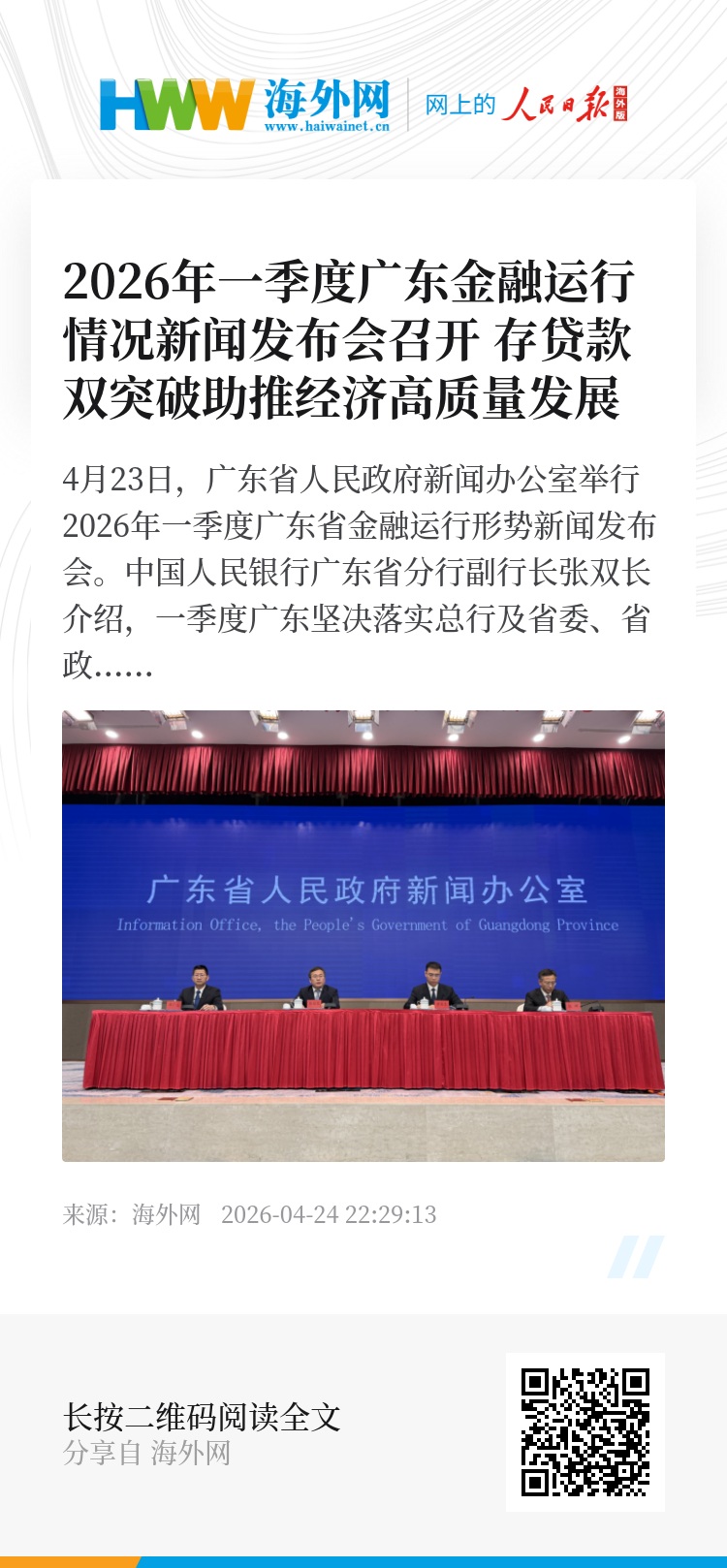 4月23日,广东省人民政府新闻办公室举行2026年一季度广东省金融运行形势新闻发布会。中国人民银行广东省分行副行长张双长介绍,一季度广东坚决落实总行及省委、省政府部署,落实适度宽松货币政策,金融总量稳步增长、结构持续优化,为广东经济高质量发展筑牢金融支撑。