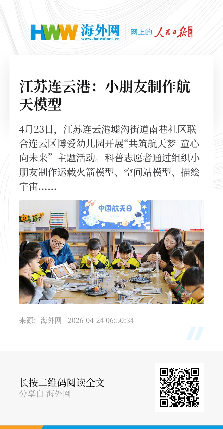 4月23日,江苏连云港墟沟街道南巷社区联合连云区博爱幼儿园开展“共筑航天梦 童心向未来”主题活动。科普志愿者通过组织小朋友制作运载火箭模型、空间站模型、描绘宇宙星空等方式,传播航天科学知识,迎接“中国航天日”的到来。图源:视觉中国
