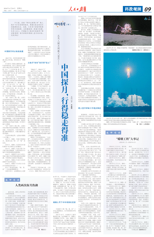 “从嫦娥一号飞向月球的那一刻起,我就知道,飞向月球的大门一经打开,深空探测的脚步就不会停止。”探月工程首任总设计师孙家栋院士说。