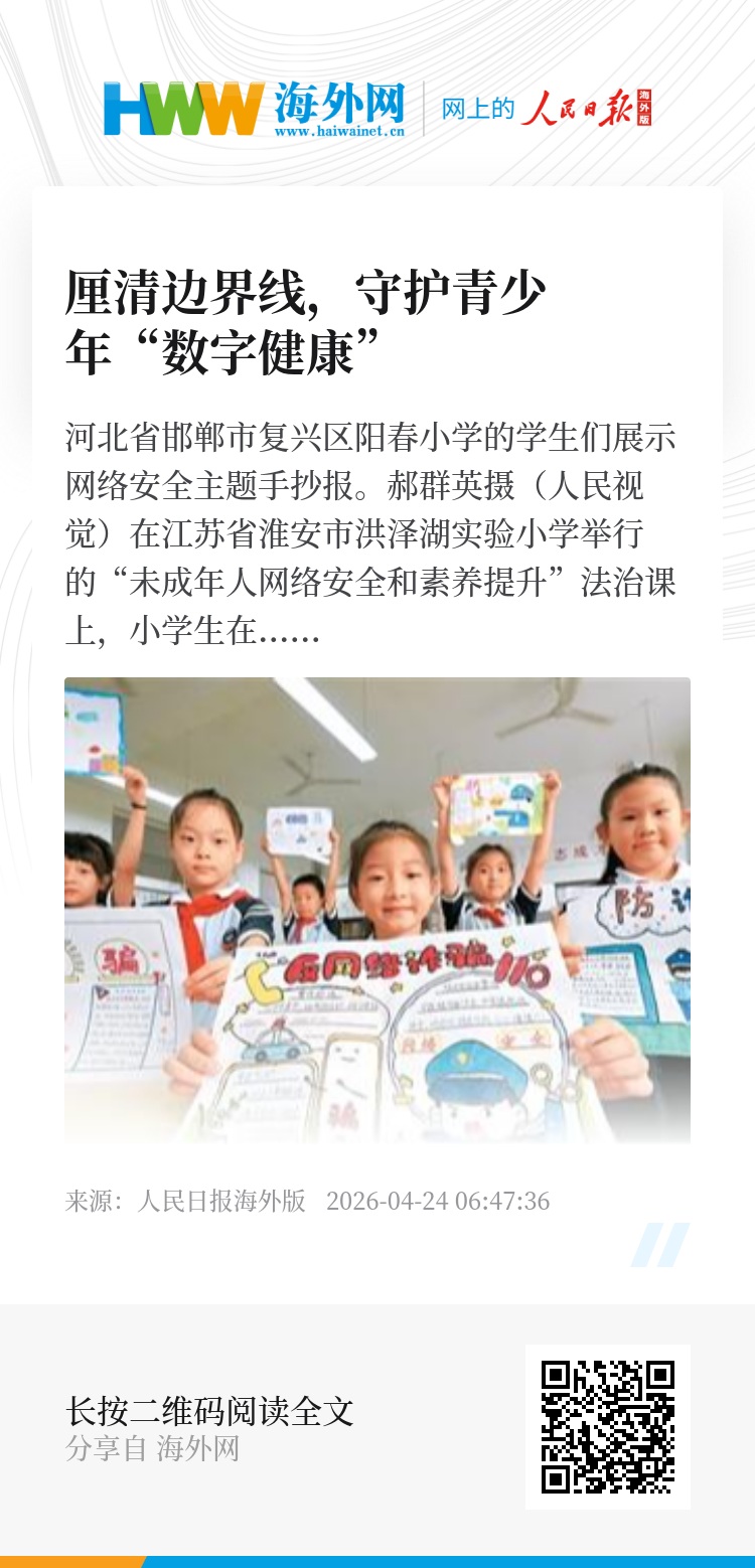 “展望未来,期待《办法》与《未成年人网络保护条例》及其他相关法律法规协同配合、有效实施,共同为未成年人在数字时代的健康成长构筑起更加坚实、可靠的防护屏障。”苑宁宁说。(刘乐艺 南彤霏)