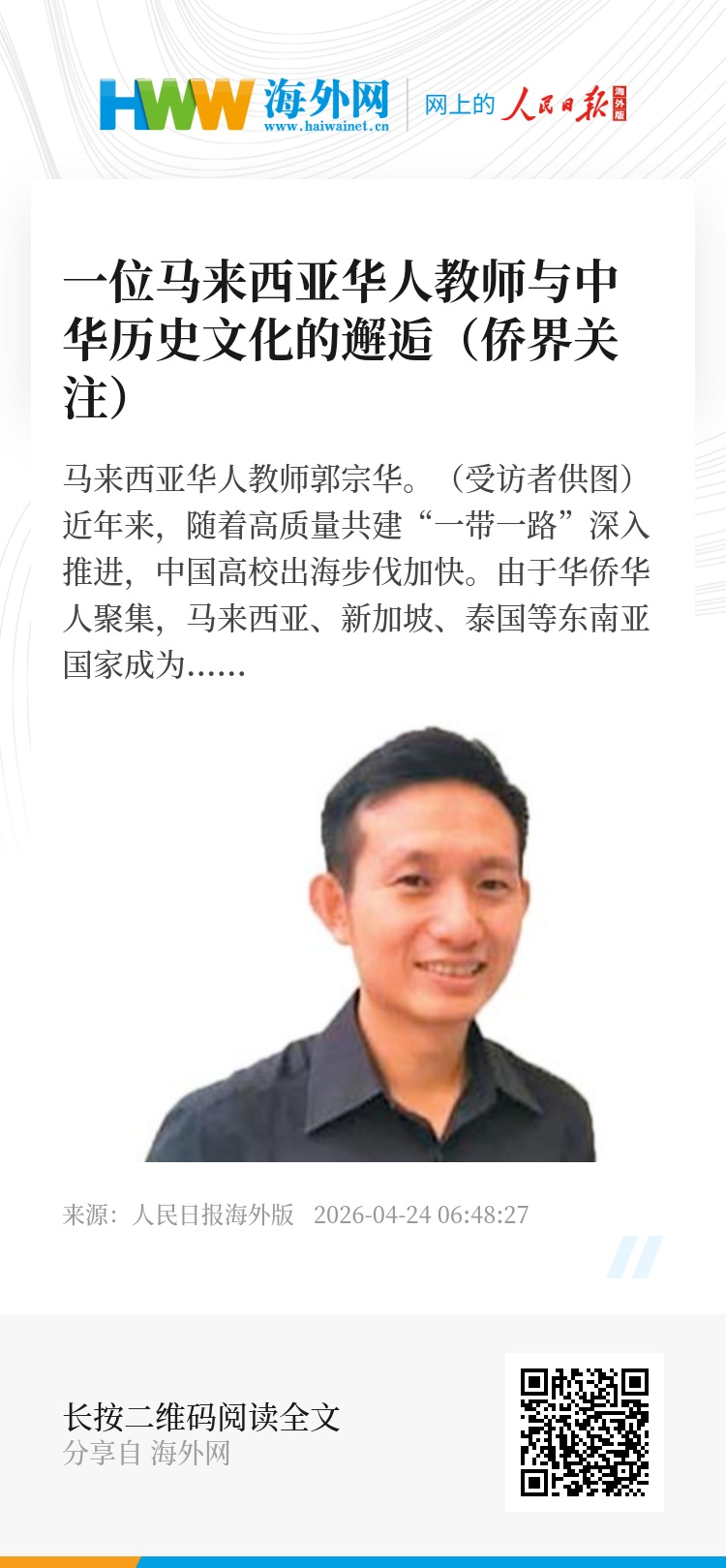 作为中国高校“走出去”的先行者,10年前,厦门大学马来西亚分校迎来首批新生,来自20多国的教师、学者先后加盟。马来西亚华人教师郭宗华就是其中一位。这名厦门大学历史学博士,他的求学、学术生涯与中华历史文化紧密联系,在中马两国“切水不断”的情谊中讲述着文明交流互鉴的故事。