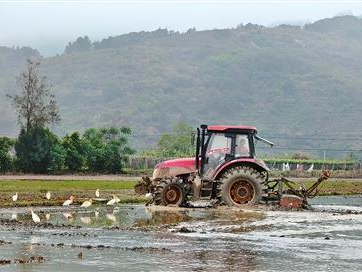 在福建省福州市连江县山堂村,农民驾驶犁地机在稻田里作业,为插秧做准备。