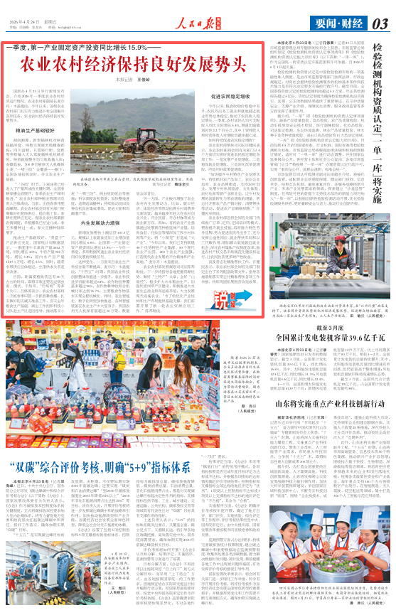 新增发放帮扶小额信贷101.3亿元、规模以上农副食品加工业增加值同比增长6.8%、全国第一产业固定资产投资同比增长15.9%……今年一季度,多项数据传递出农业农村经济向好发展的积极信号。