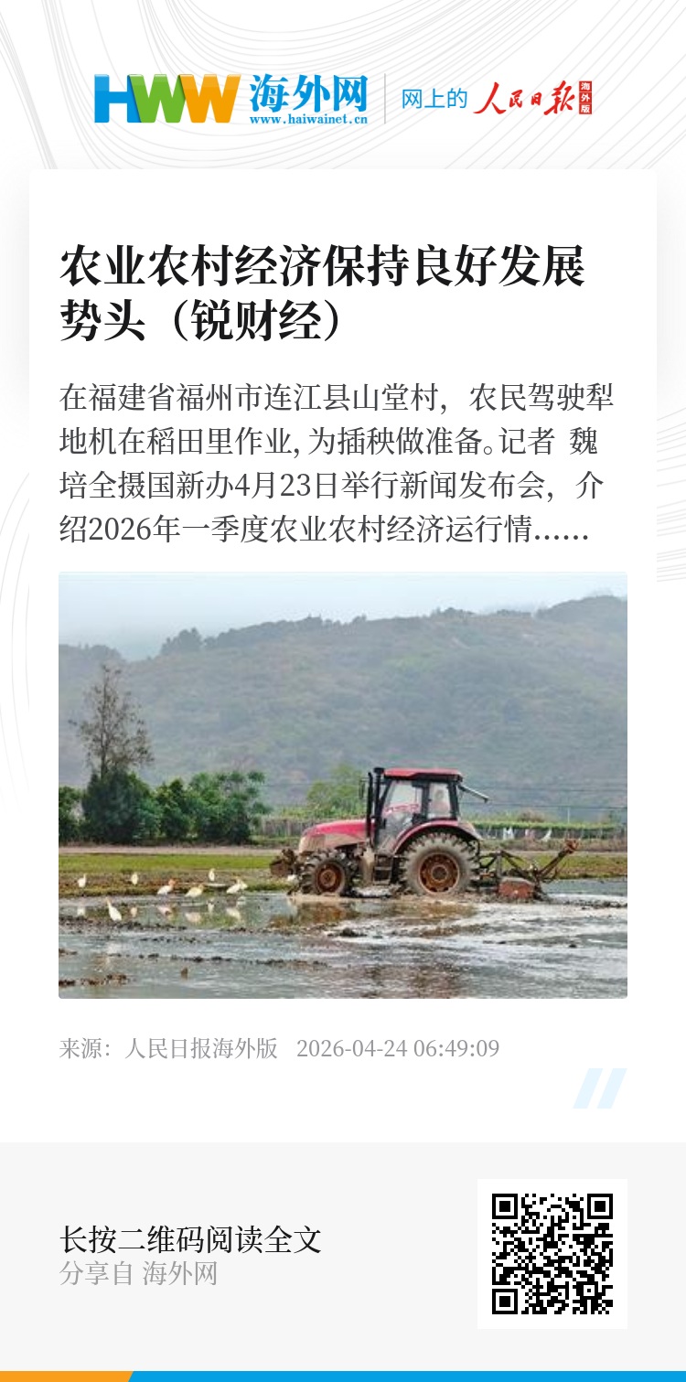 国新办4月23日举行新闻发布会,介绍2026年一季度农业农村经济运行情况。农业农村部副部长麦尔丹·木盖提说,今年以来,各级农业农村部门扎实有力推进乡村全面振兴各项任务,农业农村经济保持良好发展势头。