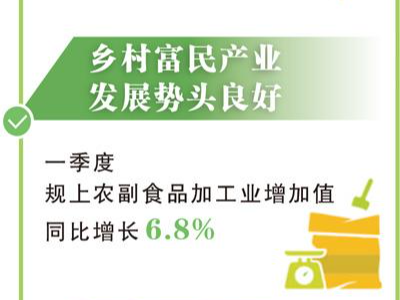 作为农民增收的重要来源,乡村富民产业发展势头良好。一季度,农产品加工业稳中有进,规模以上农副食品加工业增加值同比增长6.8%。3月,全国农业产业化国家重点龙头企业采购经理指数(PMI)为58.1%,保持在50%以上扩张区间,环比、同比分别上升6.8个、3.8个百分点,行业景气水平持续提升。