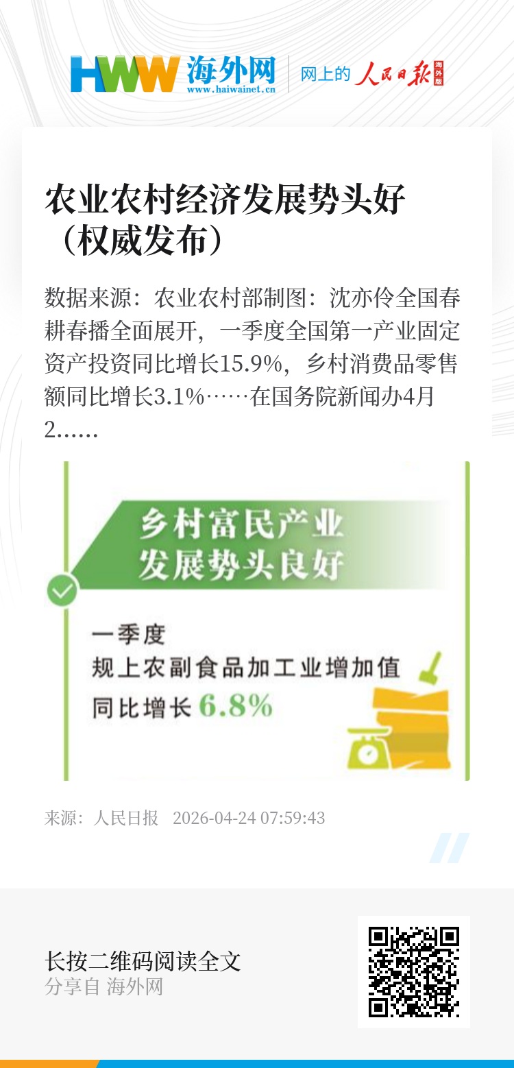 全国春耕春播全面展开,一季度全国第一产业固定资产投资同比增长15.9%,乡村消费品零售额同比增长3.1%……在国务院新闻办4月23日举行的新闻发布会上,农业农村部副部长麦尔丹·木盖提在介绍一季度“三农”形势时表示,农业农村经济保持良好发展势头。