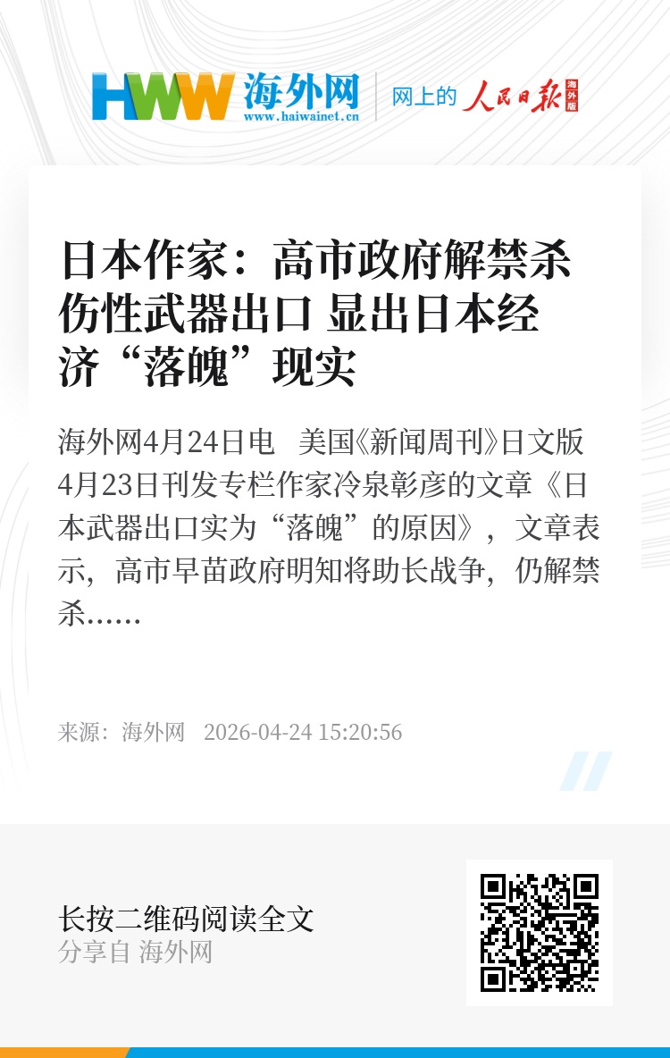 海外网4月24日电 美国《新闻周刊》日文版4月23日刊发专栏作家冷泉彰彦的文章《日本武器出口实为“落魄”的原因》,文章表示,高市早苗政府明知将助长战争,仍解禁杀伤性武器出口,是因为日本在民生用品市场完败,转而依赖军需产业,这显出日本经济“落魄”现实。
