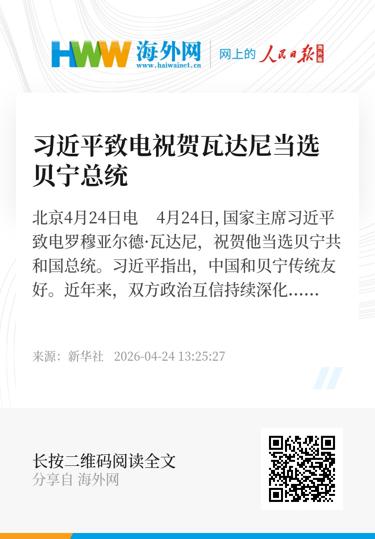 新华社北京4月24日电 4月24日,国家主席习近平致电罗穆亚尔德·瓦达尼,祝贺他当选贝宁共和国总统。