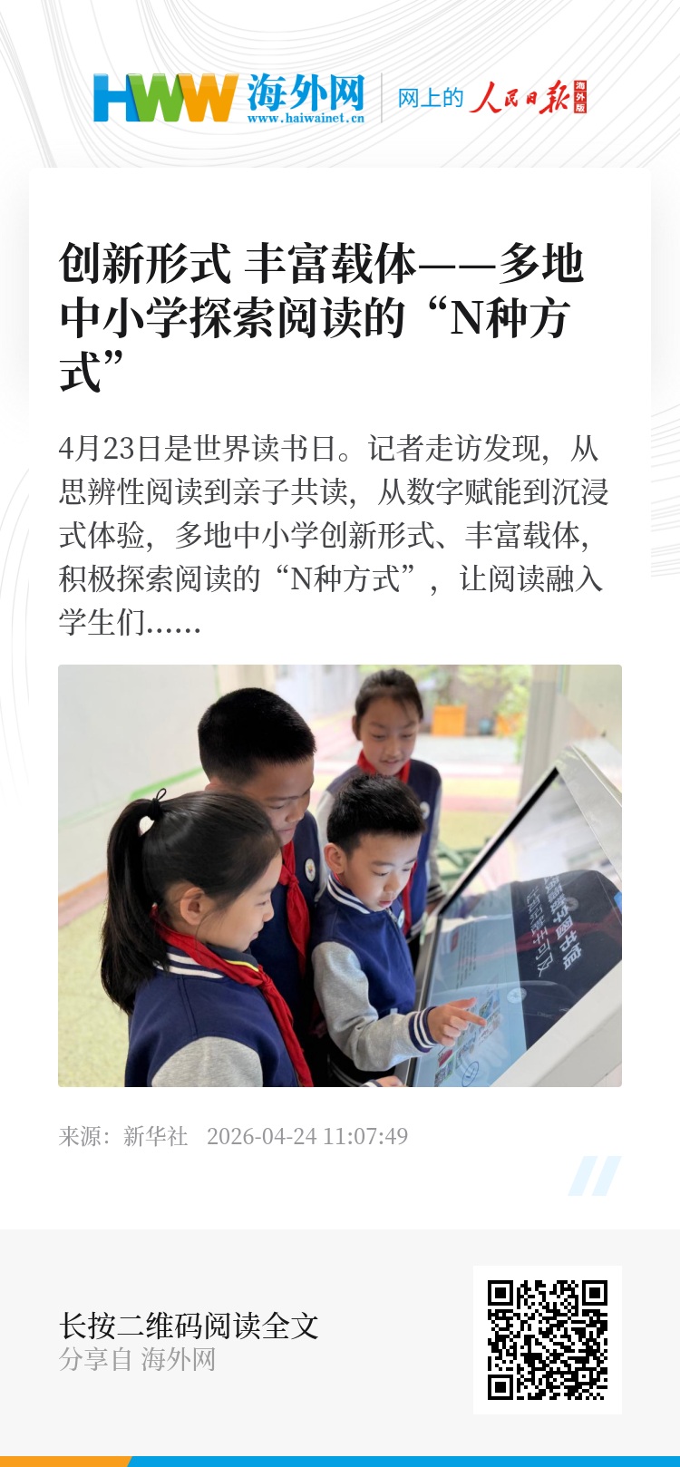 4月23日是世界读书日。记者走访发现,从思辨性阅读到亲子共读,从数字赋能到沉浸式体验,多地中小学创新形式、丰富载体,积极探索阅读的“N种方式”,让阅读融入学生们的日常学习和生活。