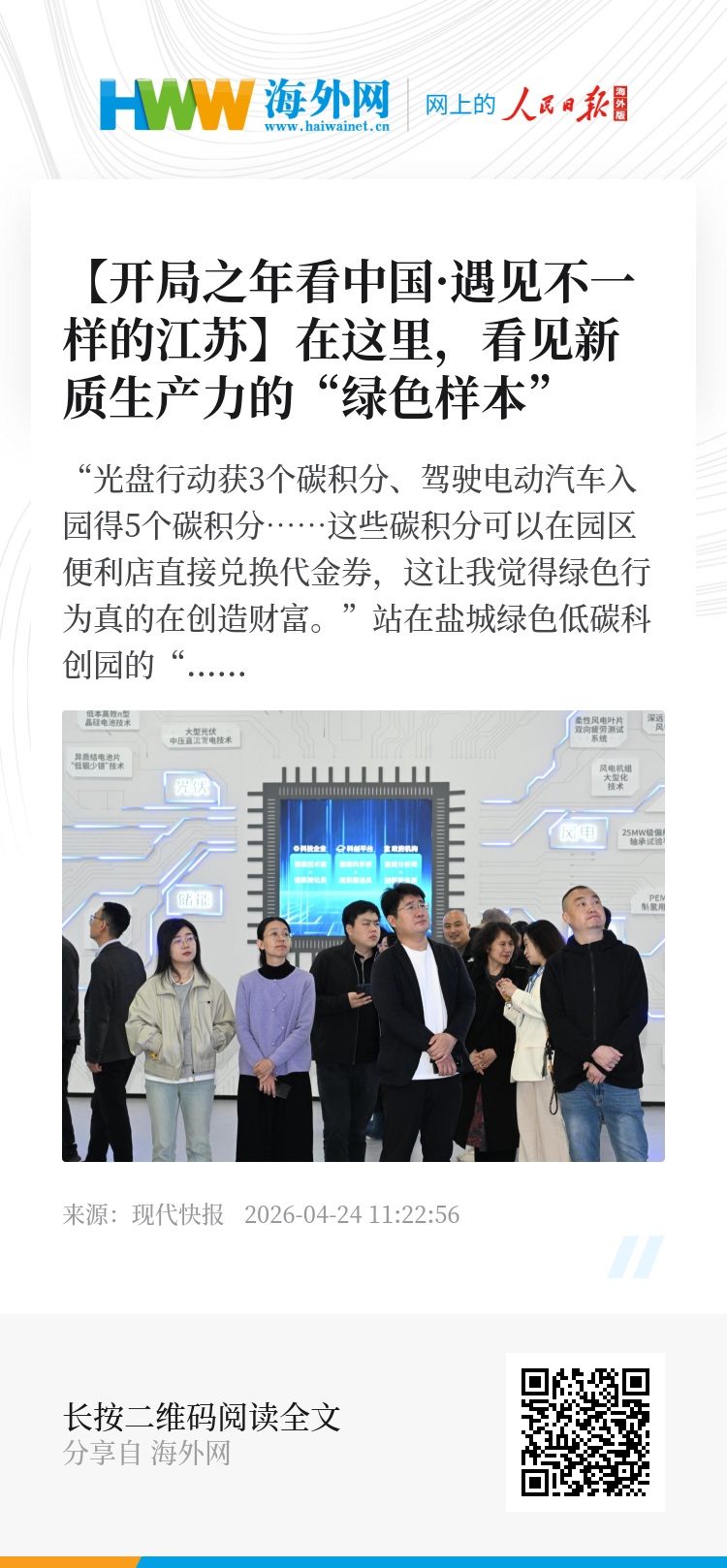 “光盘行动获3个碳积分、驾驶电动汽车入园得5个碳积分……这些碳积分可以在园区便利店直接兑换代金券,这让我觉得绿色行为真的在创造财富。”站在盐城绿色低碳科创园的“碳+AI”零碳便利店门口,媒体嘉宾们感叹道。4月23日上午,20余家全国重点媒体嘉宾,走进盐城绿色低碳科创园采访。这里正成为盐城发展新质生产力、勇当“碳路先锋”的生动缩影。