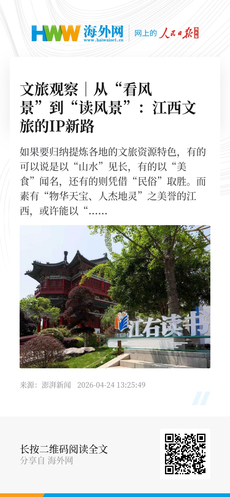 “风景这边独好”,并让更多人发现值得“读好”的江西,必将更具魅力。(澎湃新闻记者 郑问)