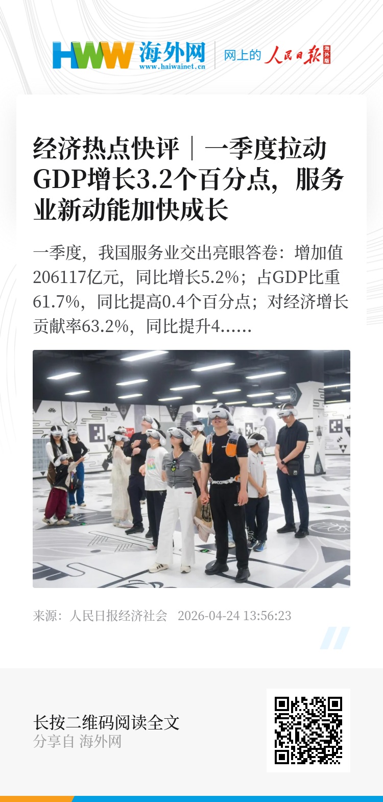 一季度,我国服务业交出亮眼答卷:增加值206117亿元,同比增长5.2%;占GDP比重61.7%,同比提高0.4个百分点;对经济增长贡献率63.2%,同比提升4.0个百分点,拉动GDP增长3.2个百分点。这份成绩单,不仅体现了服务业总量的稳步扩大,更折射出其内部结构的积极变化与增长动能的持续转换。