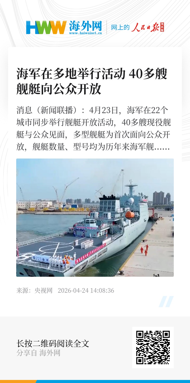 央视网消息(新闻联播):4月23日,海军在22个城市同步举行舰艇开放活动,40多艘现役舰艇与公众见面,多型舰艇为首次面向公众开放,舰艇数量、型号均为历年来海军舰艇开放活动之最。