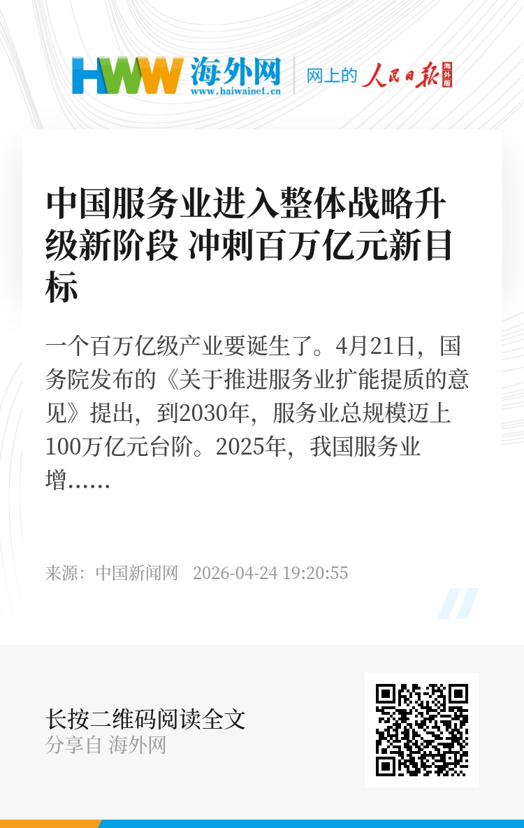 4月21日,国务院发布的《关于推进服务业扩能提质的意见》提出,到2030年,服务业总规模迈上100万亿元台阶。