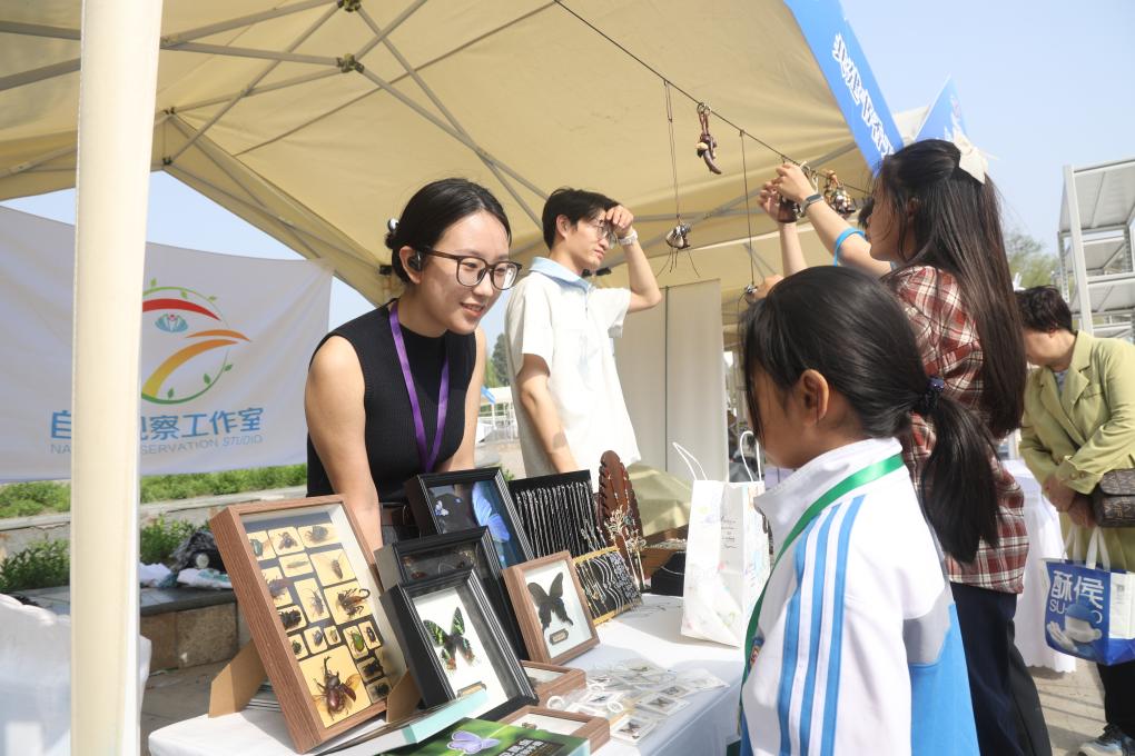 天津水上公园书市摊主在向读者介绍文创产品。(受访者供图)