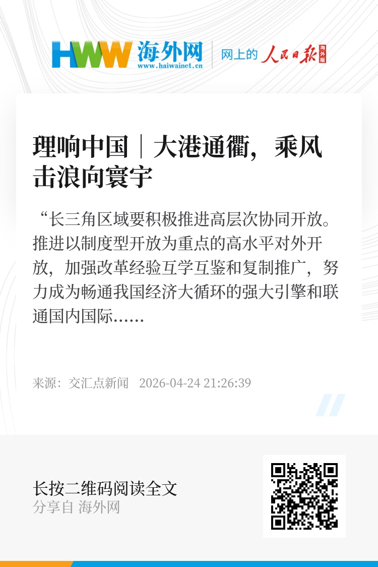 大港通衢处,长三角正驭风浪而笃行。从清晨5时宁波舟山港的钢铁巨臂,到夜晚上海洋山港的智能桥吊,从安徽合肥港派河港驶向欧洲的新能源车队,到江苏苏州太仓港驶向南非的滚装巨轮,长三角港口群昼夜不息。“扩大高水平对外开放,广泛开拓全球市场,更好联通国际循环。”“十五五”开局之年,总书记在今年全国两会上的重要指示言犹在耳。以更高水平对外开放推动高质量发展,长三角地区正在全球贸易版图上书写新的篇章。