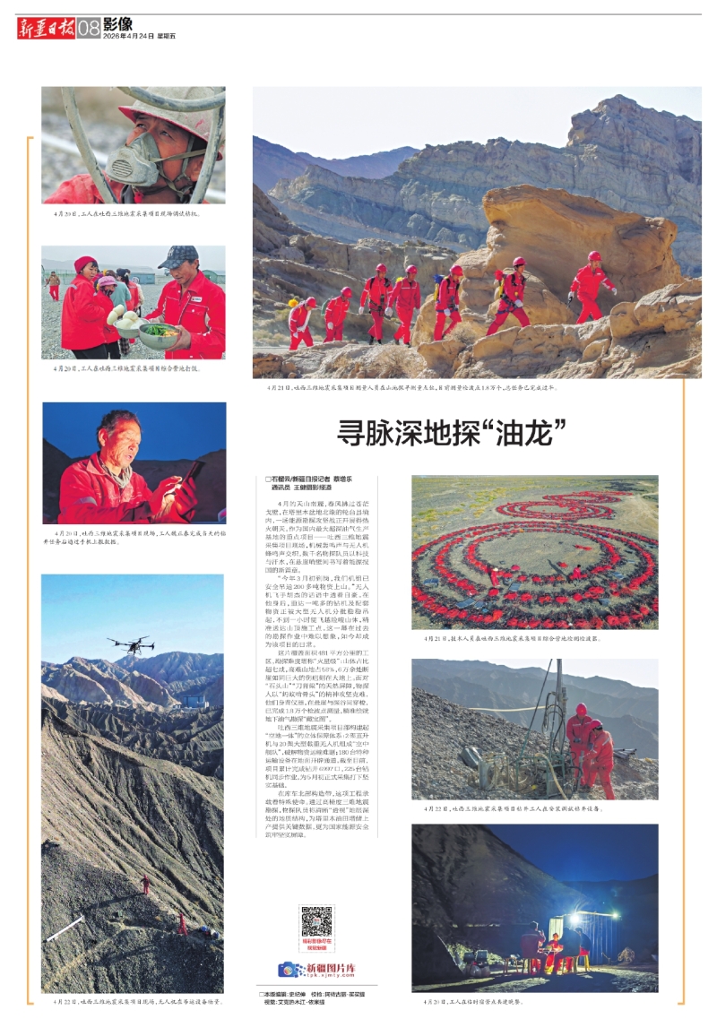 4月的天山南麓,春风拂过苍茫戈壁,在塔里木盆地北缘的轮台县境内,一场能源勘探攻坚战正开展得热火朝天。作为国内最大超深油气生产基地的重点项目——吐西三维地震采集项目现场,机械轰鸣声与无人机蜂鸣声交织,数千名物探队员以科技与汗水,在悬崖峭壁间书写着能源报国的新篇章。