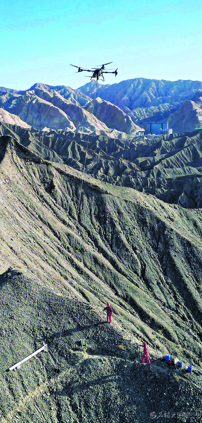 “今年3月初到岗,我们机组已安全吊运200多吨物资上山。”无人机飞手胡杰的话语中透着自豪。在他身后,重达一吨多的钻机及配套物资正被大型无人机分批稳稳吊起,不到一小时便飞越险峻山体,精准送达山顶施工点。这一幕在过去的勘探作业中难以想象,如今却成为该项目的日常。