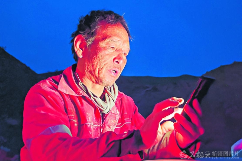4月20日,吐西三维地震采集项目现场,工人魏正春完成当天的钻井任务后通过手机上报数据。