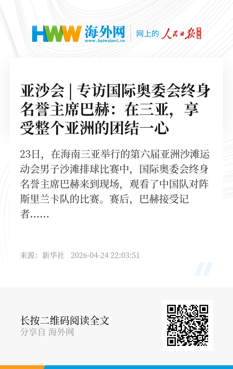 23日,在海南三亚举行的第六届亚洲沙滩运动会男子沙滩排球比赛中,国际奥委会终身名誉主席巴赫来到现场,观看了中国队对阵斯里兰卡队的比赛。
