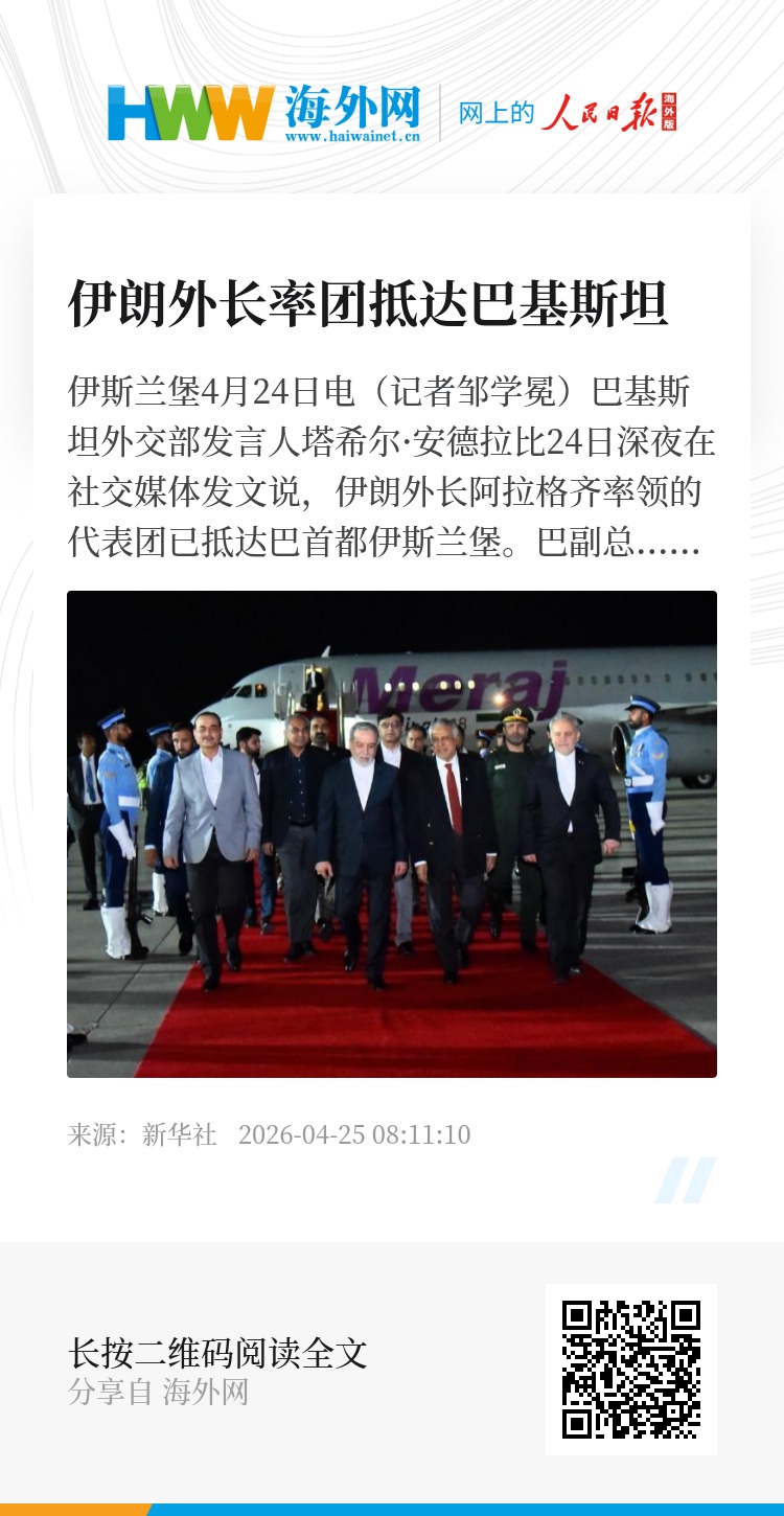 新华社伊斯兰堡4月24日电(记者邹学冕)巴基斯坦外交部发言人塔希尔·安德拉比24日深夜在社交媒体发文说,伊朗外长阿拉格齐率领的代表团已抵达巴首都伊斯兰堡。巴副总理兼外长达尔、陆军参谋长穆尼尔等高级官员到场迎接。