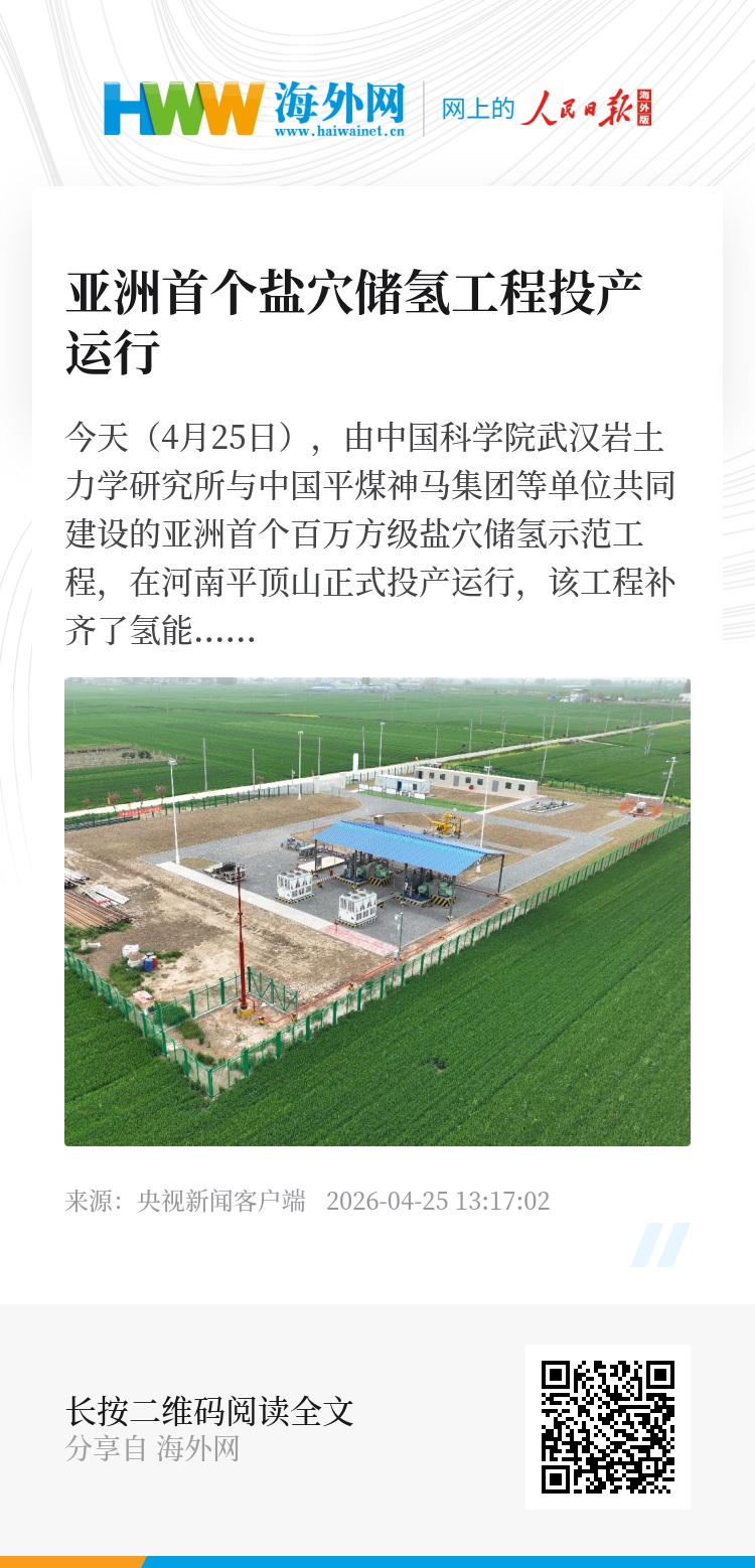 今天(4月25日),由中国科学院武汉岩土力学研究所与中国平煤神马集团等单位共同建设的亚洲首个百万方级盐穴储氢示范工程,在河南平顶山正式投产运行,该工程补齐了氢能大规模、低成本储存关键短板,标志着我国氢能“制—储—输—用”正式迈入产业化新阶段。