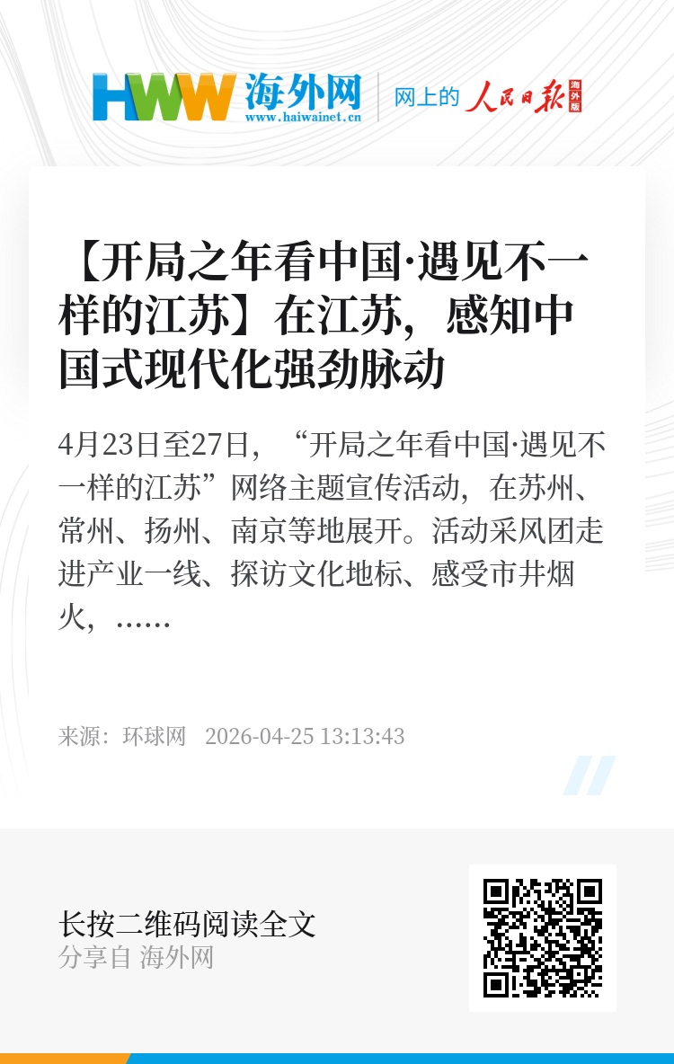 4月23日至27日,“开局之年看中国·遇见不一样的江苏”网络主题宣传活动,在苏州、常州、扬州、南京等地展开。活动采风团走进产业一线、探访文化地标、感受市井烟火,所见所闻,让人深刻领略到一幅硬核智造与人间烟火交织融合的动人图景。这不只是一场采风活动,更是一扇观察中国式现代化区域实践的重要窗口。
