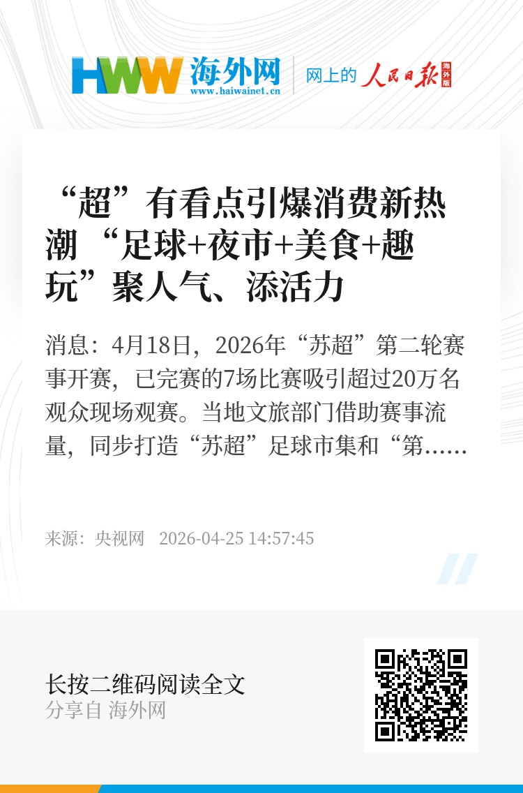 央视网消息:4月18日,2026年“苏超”第二轮赛事开赛,已完赛的7场比赛吸引超过20万名观众现场观赛。当地文旅部门借助赛事流量,同步打造“苏超”足球市集和“第二现场”观赛点,激活当地市场多元活力。