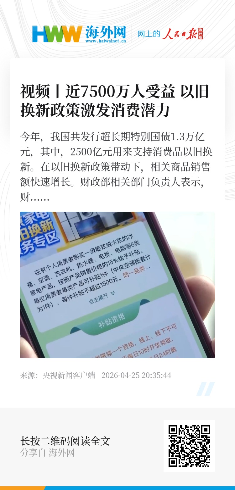 财政部相关部门负责人表示,财政部已分两批累计下达超长期特别国债资金1250亿元,支持消费者购新换新,同时有效稳定各方预期。截至上周,消费品以旧换新已带动相关商品销售额超5400亿元,惠及近7500万人次。