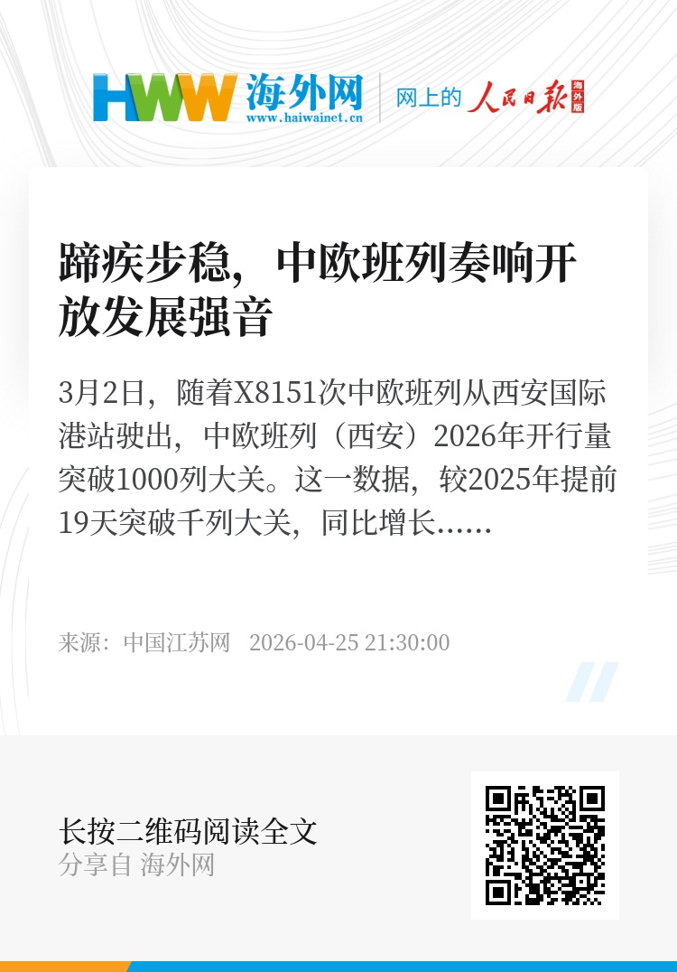 汽笛声声,驼铃悠悠。开放的大门越开越大,合作的步伐越走越稳。透过中欧班列这扇流动的窗口,我们看见中国经济蓬勃的开放活力。沿着共赢之路阔步前行,中国正与各方携手,书写更加精彩的发展篇章。(胡辉)
