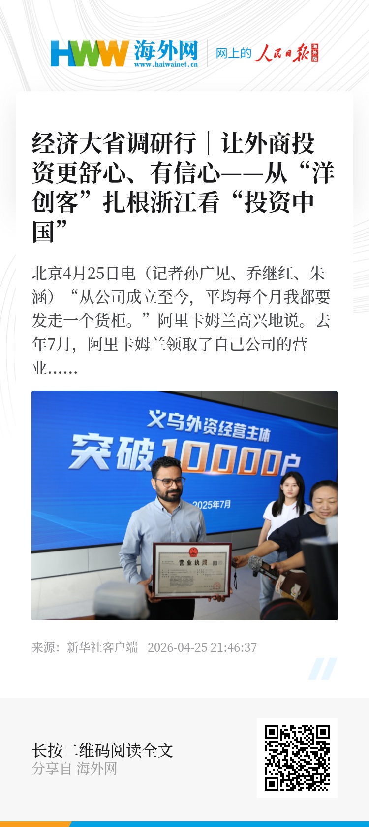 新华社北京4月25日电(记者孙广见、乔继红、朱涵)“从公司成立至今,平均每个月我都要发走一个货柜。”阿里卡姆兰高兴地说。去年7月,阿里卡姆兰领取了自己公司的营业执照,他的公司成为义乌第1万户外资经营主体。这位来自巴基斯坦的留学生正式成为浙江千千万万外籍创业者中的一员。