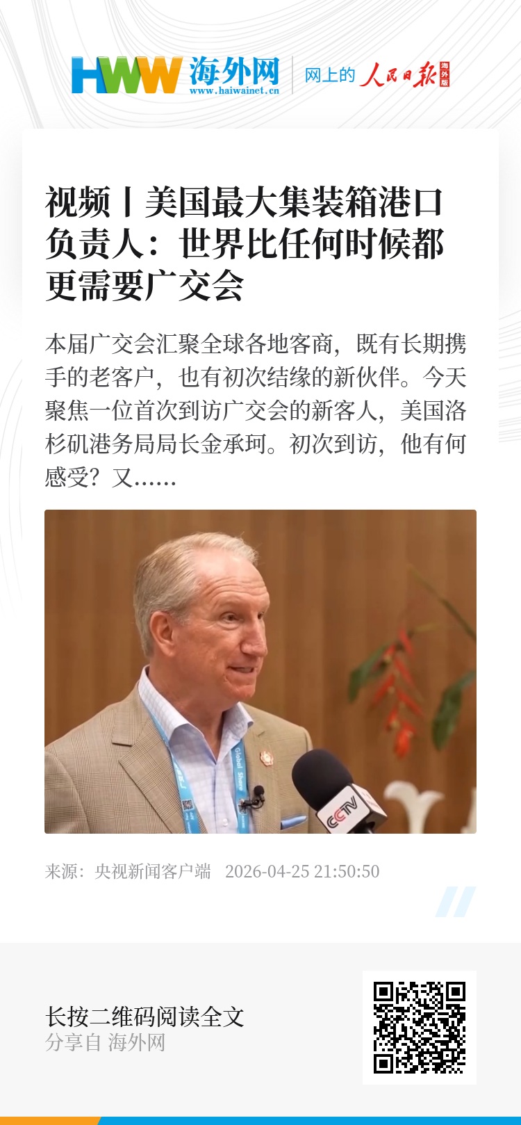 本届广交会汇聚全球各地客商,既有长期携手的老客户,也有初次结缘的新伙伴。今天聚焦一位首次到访广交会的新客人,美国洛杉矶港务局局长金承珂。初次到访,他有何感受?又在广交会的现场有了哪些收获?