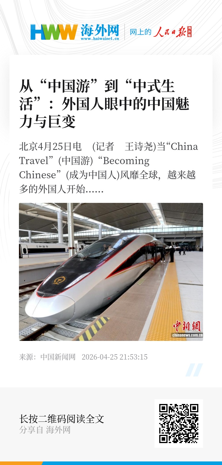 中新网北京4月25日电 (记者 王诗尧)当“China Travel”(中国游)“Becoming Chinese”(成为中国人)风靡全球,越来越多的外国人开始走进中国,亲身体验这个古老而又充满活力的国家。他们中有人短暂停留,有人则选择长期生活,成为中国发展的见证者、参与者与传播者。