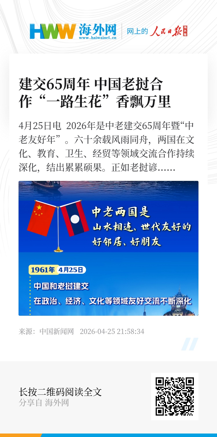 中新网4月25日电 2026年是中老建交65周年暨“中老友好年”。六十余载风雨同舟,两国在文化、教育、卫生、经贸等领域交流合作持续深化,结出累累硕果。