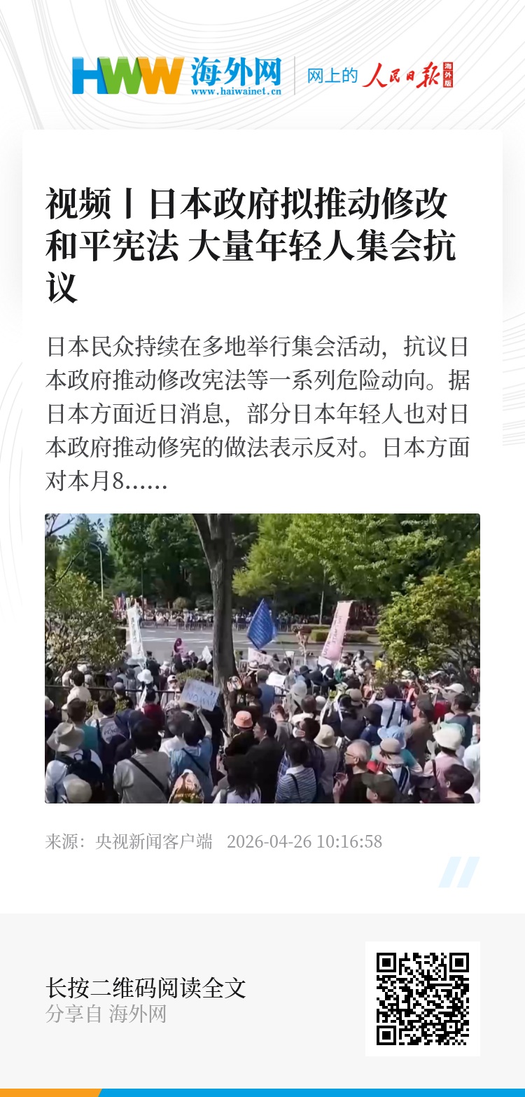 东京上智大学政治学教授中野晃一表示,美国和以色列与伊朗的战事已经迫使日本年轻人发声。这场战争“让人们认识到日本在首相高市早苗领导下可能卷入非法战争,越来越多的人感到有必要表达他们对宪法第九条的支持,作为防止战争的最后一道堡垒”。