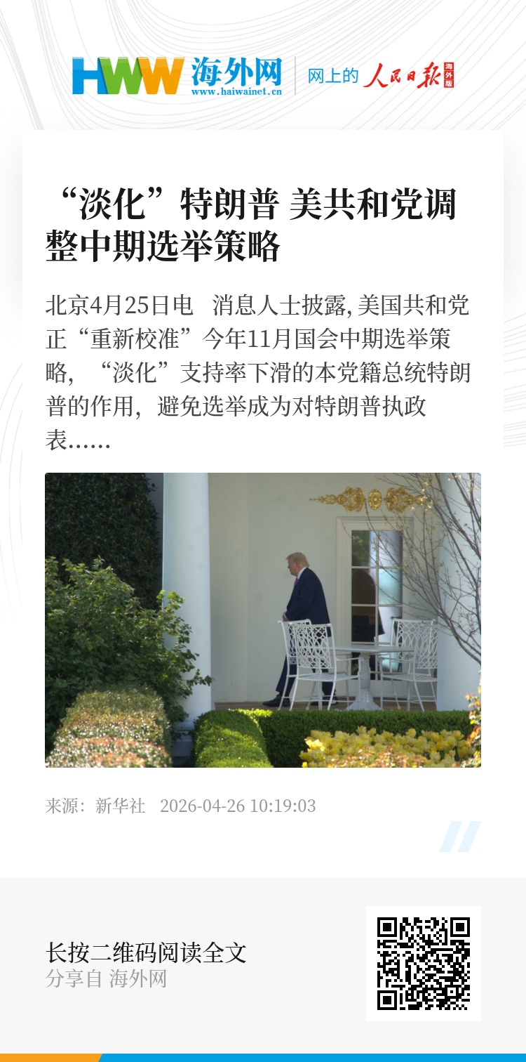 新华社北京4月25日电 消息人士披露,美国共和党正“重新校准”今年11月国会中期选举策略,“淡化”支持率下滑的本党籍总统特朗普的作用,避免选举成为对特朗普执政表现的“全民公决”。