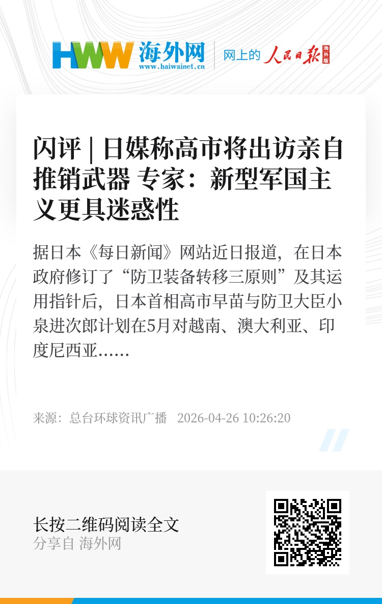 据日本《每日新闻》网站近日报道,在日本政府修订了“防卫装备转移三原则”及其运用指针后,日本首相高市早苗与防卫大臣小泉进次郎计划在5月对越南、澳大利亚、印度尼西亚和菲律宾进行访问,意在向各国说明日本政府加速装备品出口的方针,并亲自进行“高层营销”。