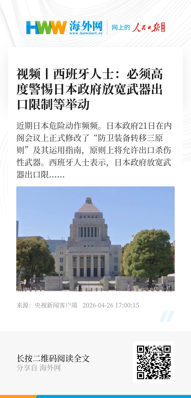 西班牙人士表示,日本政府放宽武器出口限制等一系列举动非常令人担忧,危及地区乃至世界的和平与稳定,必须予以高度警惕。国际社会也必须对此予以强烈谴责。