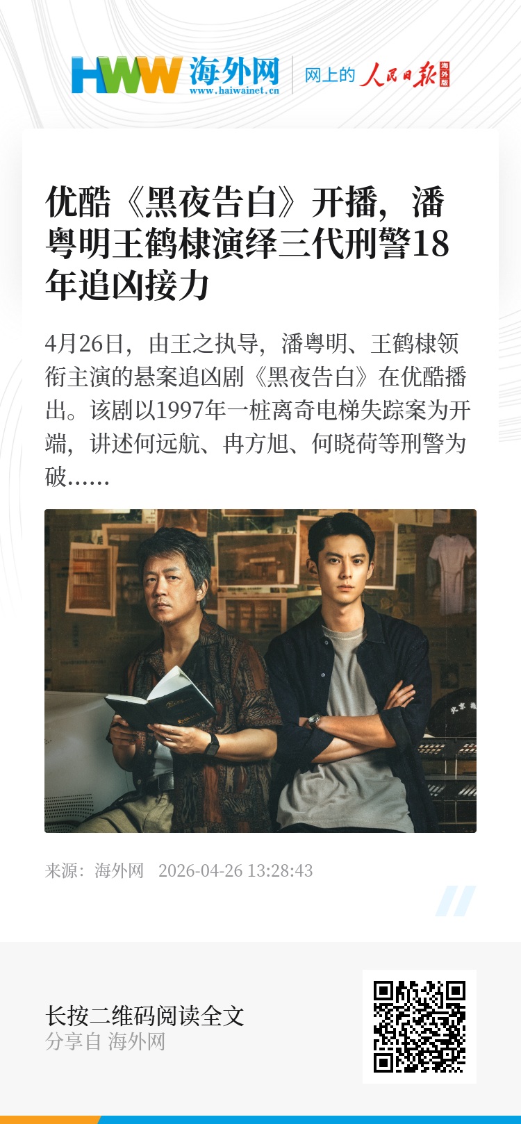 4月26日,由王之执导,潘粤明、王鹤棣领衔主演的悬案追凶剧《黑夜告白》在优酷播出。该剧以1997年一桩离奇电梯失踪案为开端,讲述何远航、冉方旭、何晓荷等刑警为破悬案,跨越18年接力侦查的故事。通过刻画1997、2002、2015三重时空的交织叙事,展现了三代刑警的使命传承与职业坚守。