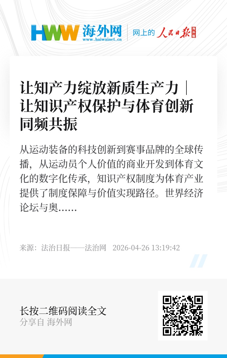正如世界知识产权组织总干事邓鸿森在2026年世界知识产权日致辞中所言,在每一个被打破的纪录和每一次令人惊叹的表现背后,有一些重要的东西是大多数粉丝从未看见的——创新、创意、知识产权。知识产权不仅是保护创新成果的法律工具,更是推动这一万亿级市场持续扩容、推动体育产业升级迭代、促进国际交流合作深化、激发全民体育热情的关键驱动力。