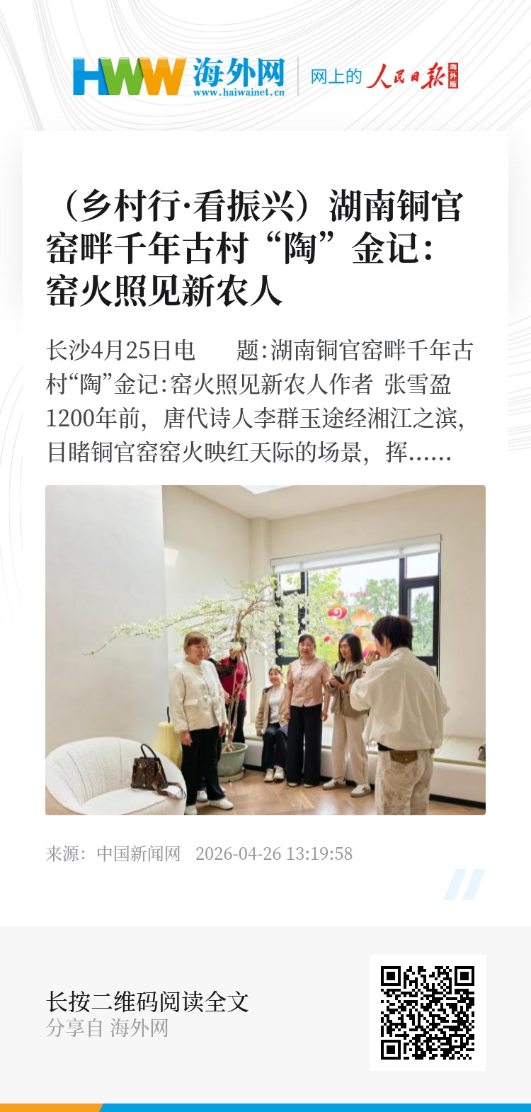 中新网长沙4月25日电 题:湖南铜官窑畔千年古村“陶”金记:窑火照见新农人