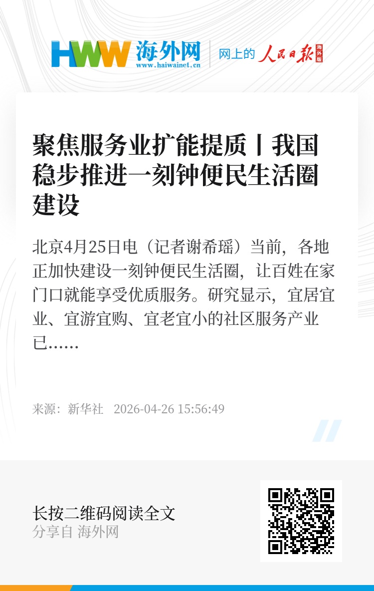 新华社北京4月25日电(记者谢希瑶)当前,各地正加快建设一刻钟便民生活圈,让百姓在家门口就能享受优质服务。研究显示,宜居宜业、宜游宜购、宜老宜小的社区服务产业已形成10万亿元级规模的消费市场。