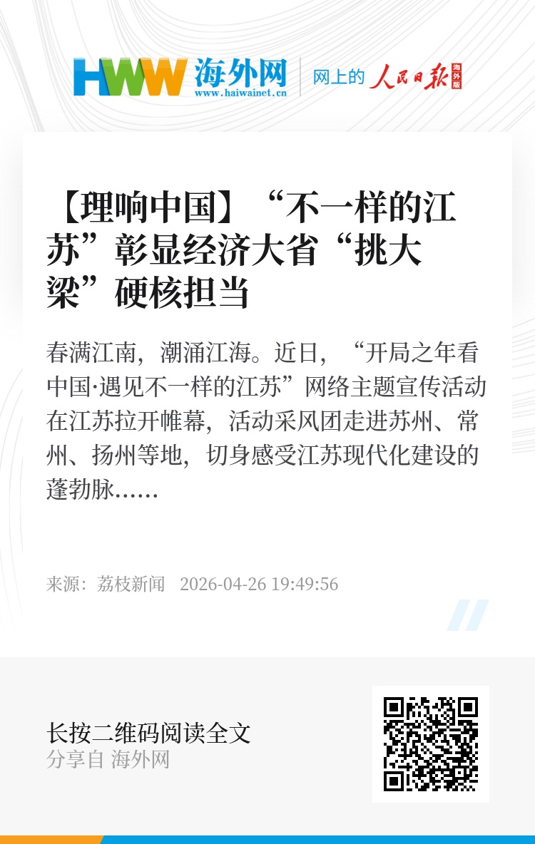 “开局之年看中国”,我们看到的不只是一个经济大省的“硬核”担当,更是一个民族在现代化道路上奋进向前的坚定身影。从制造根基的持续夯实,到创新引领的深度突破,再到高质量发展的全域实践,江苏的探索汇聚成中国式现代化恢宏乐章中的一段昂扬旋律,也为“十五五”新征程写下了充满信心的发展篇章。(黄小勤)