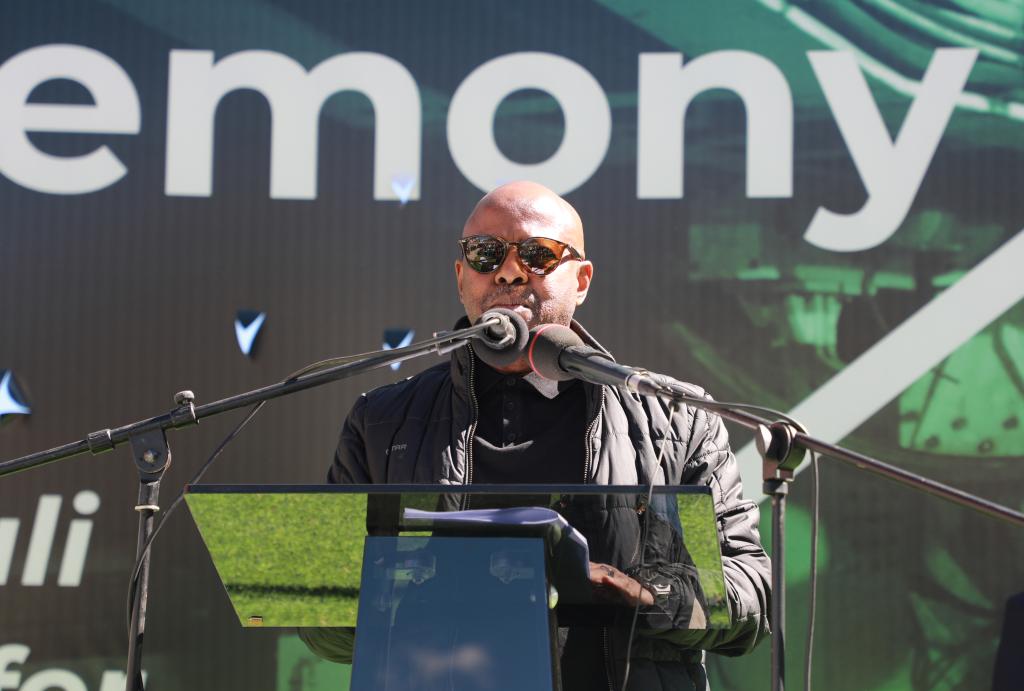 4月20日,在莱索托东部莫霍特隆,莱索托自然资源大臣莫洛米·莫莱科在“大禹·雪盾号”始发掘进仪式上讲话。新华社发(何箬楠摄)
