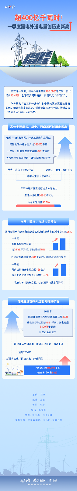 作为国家“三基地一通道”和全国能源资源战略保障基地,新疆正持续发挥“西电东送”核心送端作用。2026年一季度,疆电外送电量达400.08亿千瓦时,同比增长23.42%,创下历史同期新高。这份亮眼“成绩单”背后,藏着哪些硬核操作?本期《数说“新”变化》,带你一探究竟。