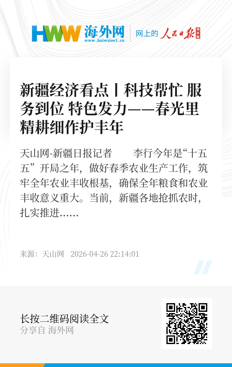 当前,新疆各地抢抓农时,扎实推进春耕春管各项工作,聚焦特色优势产业提质增效,全力打好全年农业丰收“第一仗”,为推动一产经济实现高质量发展、“十五五”良好开局提供坚实支撑。
